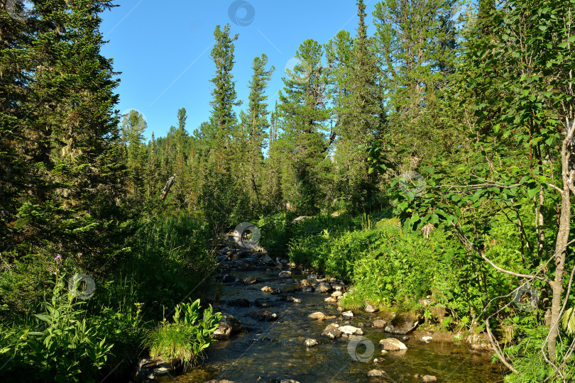 Высокие кедры стоят плотной стеной вдоль берегов красивой горной реки с торчащими из воды камнями в солнечный летний день. Река Буйба, Ергаки, Красноярский край, Сибирь, Россия.