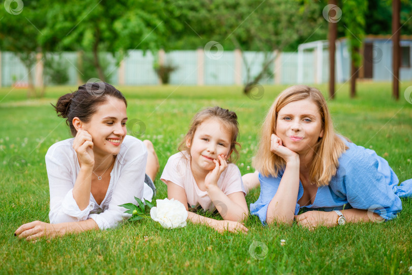 Веселая семья в парке, мама с дочкой и бабушка лежат на зеленой траве, счастливые улыбки, симпатичные кавказские девушки разных возрастов наслаждаются днем, проведенным вместе, веселясь летним днем