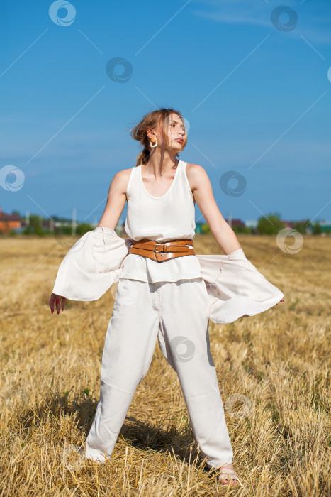 Портрет в полный рост молодая красивая блондинка в бежевом костюме позирует на фоне скошенного пшеничного поля