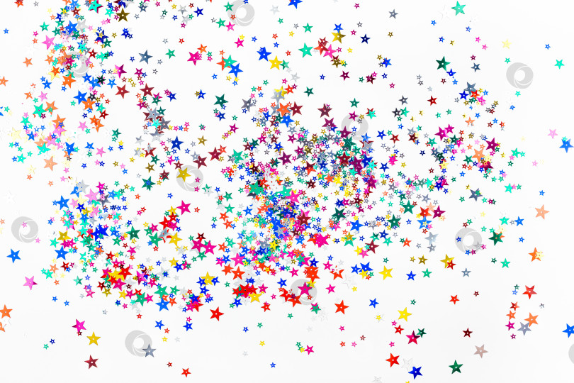 Яркая праздничная звездочка из конфетти сверкает на белом фоне. Креативный концептуальный рождественский праздник, день рождения, вид сверху, плоский фон для вашего блога, текста или дизайна