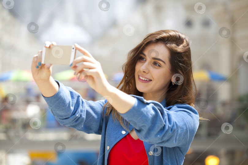 Красивая улыбающаяся брюнетка фотографирует себя на смартфон. селфи, снимок в помещении, горизонтальный