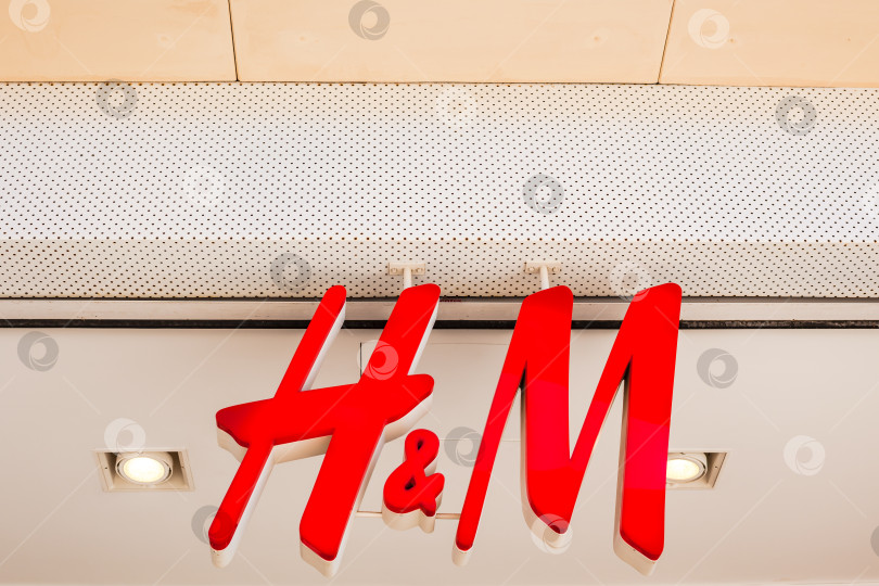 ОРИУЭЛА, ИСПАНИЯ - 13 февраля 2019 года: Фирменный логотип международной сети розничных магазинов одежды H&M на здании, расположенном в торговом районе Ориуэла, Испания.