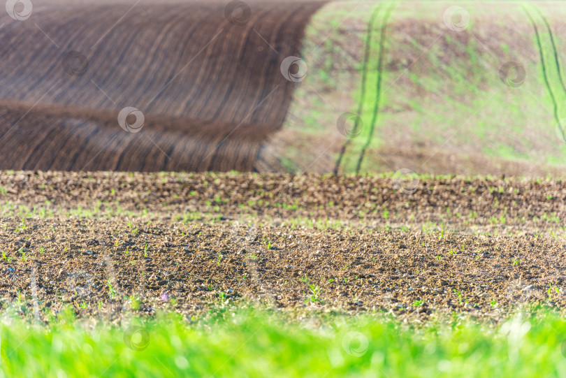 Сельскохозяйственное поле на холме с молодыми всходами. Горизонтальный снимок
