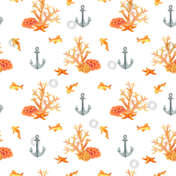 Акварельный бесшовный узор с рыбками, якорями, ракушками, морскими звездами и кораллами на белом фоне. Подводный мир. Жизнь в океане. Простой дизайн для летней ткани или обоев в морском стиле. Акварельный бесшовный рисунок с изображением подводного мира, рыб, якорей, ракушек, морских звезд и кораллов на белом фоне. Жизнь в океане. Простой дизайн для летней ткани или обоев в морском стиле