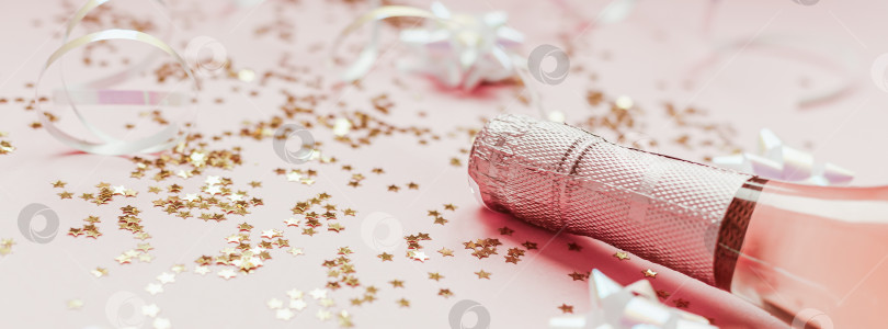 Рождественская или новогодняя композиция с бутылками розового шампанского и золотыми конфетти в виде звездочек на пастельно-розовом фоне, вид сбоку. Креативная концепция праздничной вечеринки