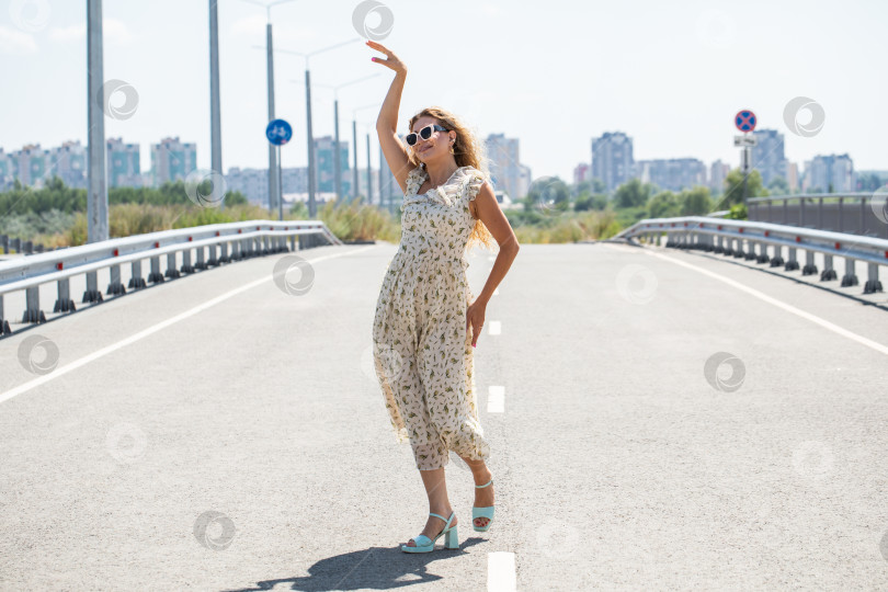 Портрет молодой красивой женщины, идущей в белом летнем платье