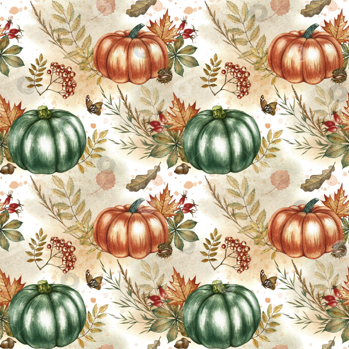 Бесшовный осенний узор с тыквами, листьями и цветами. Акварельная иллюстрация ручной работы. На цветном фоне. Для упаковки, декора, текстиля и обоев, печати и оберточной бумаги