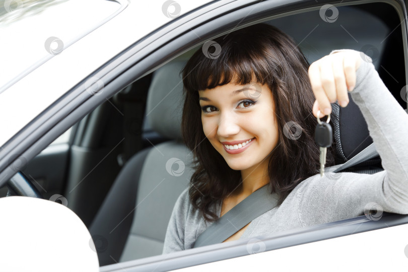 Симпатичная женщина-водитель в белой машине показывает ключи от машины