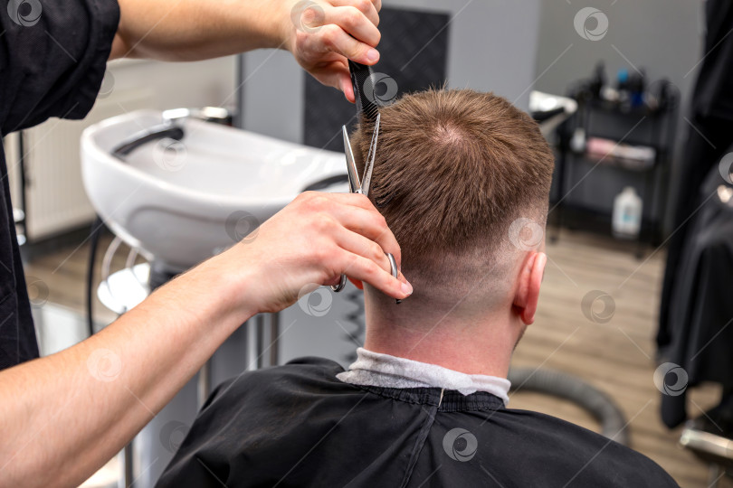 Парикмахер, подстригающий молодого человека в парикмахерской, снимок крупным планом