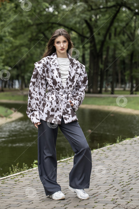 Портрет молодой красивой брюнетки. Стильный жакет - черно-белая пятнистая корова.