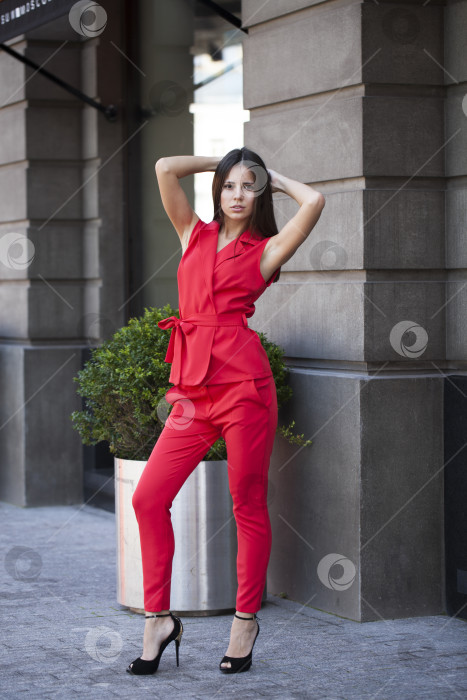 Портрет в полный рост красивой молодой женщины в красном костюме, летняя улица на открытом воздухе