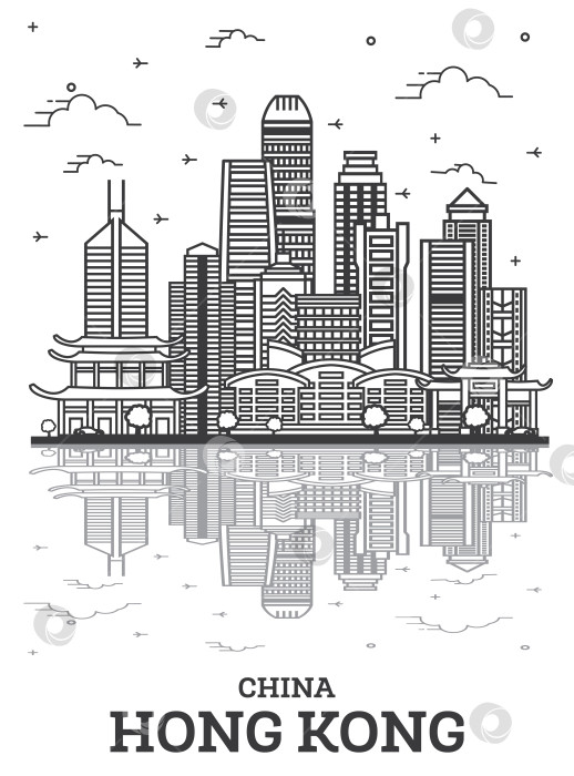 Обрисуйте горизонт Гонконга, Чайна-Сити, с современными зданиями и отражениями, выделенными на белом фоне. векторная иллюстрация. Городской пейзаж Гонконга с достопримечательностями.