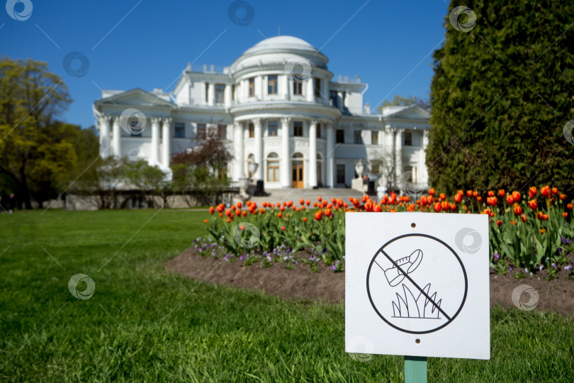 Санкт-Петербург, Россия - 16 мая 2025 года: Фестиваль тюльпанов, надпись "Не ходите по траве" на зеленой лужайке на переднем плане