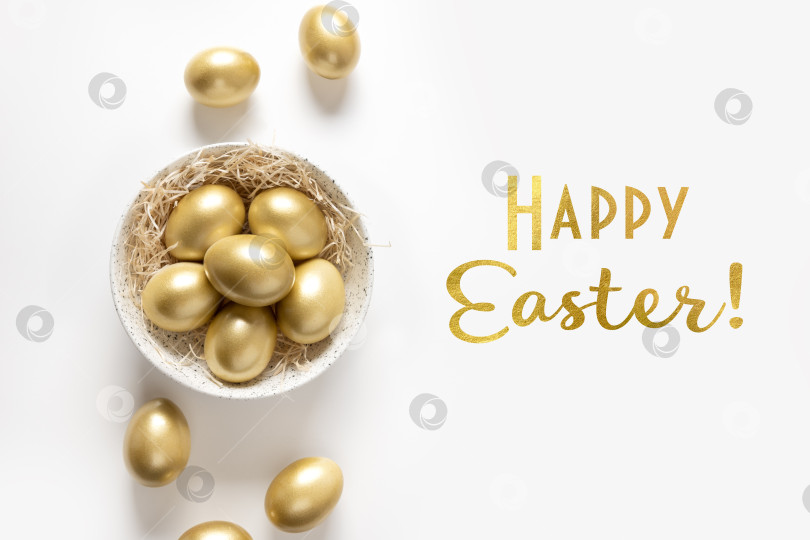 Пасхальная поздравительная открытка с золотыми куриными яйцами в миске на белом фоне. Текст - С Пасхой. Вид сверху.