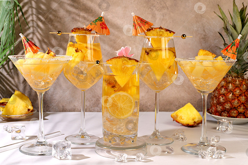 Различные алкогольные коктейли с кусочками манго, ананаса и льдом в бокалах с ободками и зонтиками. Концепция тропической вечеринки и отдыха. Рекламная визитка для меню бара и ресторана.