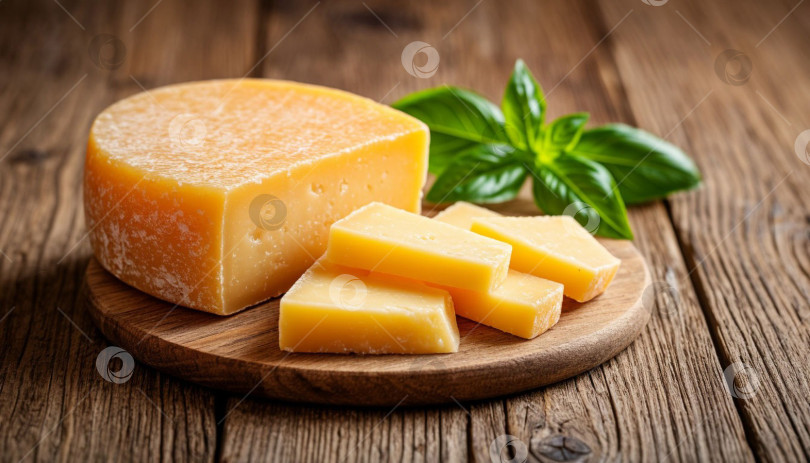 Сыр пармезан на деревянном фоне, свободное место для копирования. Создан искусственный интеллект.