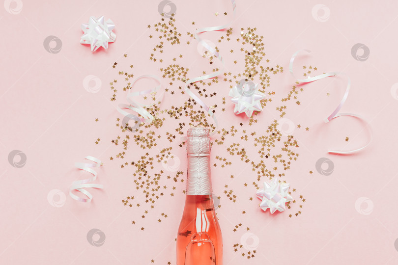 Рождественская или новогодняя композиция из бутылок розового шампанского и конфетти в виде звездочек с золотистыми искорками на пастельно-розовом фоне, вид сверху. Праздничная плоская композиция. Креативная концепция вечеринки