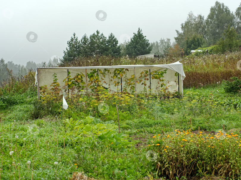 Старая теплица в поле в пасмурный день, Россия