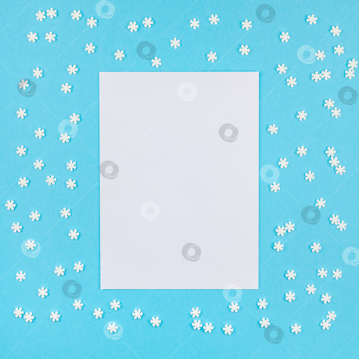 Креативный вид сверху на плоскую зимнюю рамку. Квадратный макет, выполненный из маленьких белых снежинок, конверт для писем на пастельно-голубом фоне, копирующий шаблон в стиле минимализма для оформления пригласительных открыток на годовщину