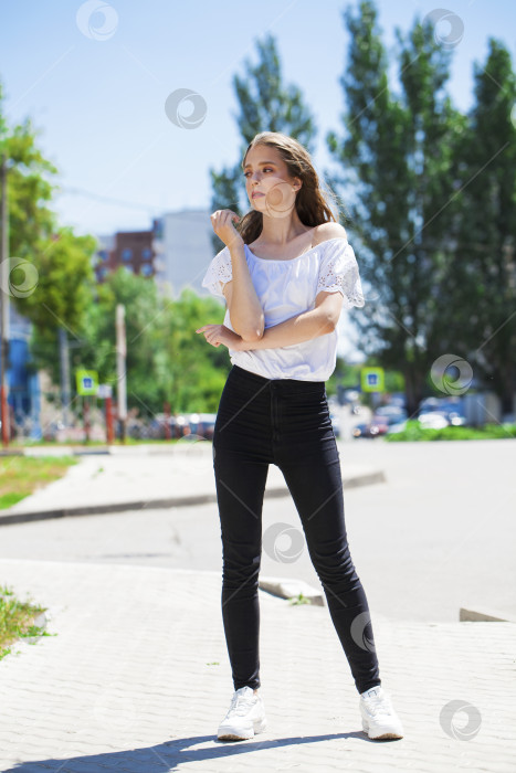 Молодая модель в полный рост. Портрет молодой красивой брюнетки в джинсах и белой блузке, идущей по летней улице