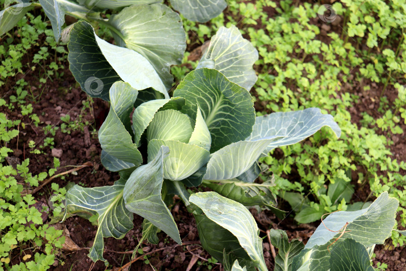 Развивающийся кочан белокочанной капусты на грядке с овощами - цветное горизонтальное фото, крупный план, вид сверху