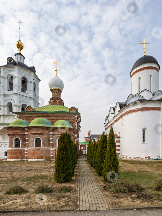 Поселок Луговой, Дмитровский район Московской области, Россия. Март 2025 года. Николо-Пешношский монастырь, где расположены Никольский собор и церковь Сергия Радонежского. Приятная аллея с туями ведет к этому великолепному архитектурному памятнику.