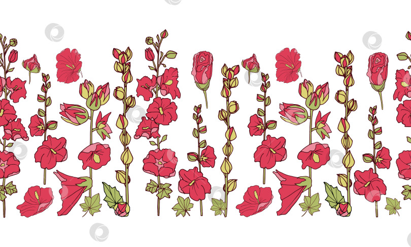 Бесшовный узор с красными мальвами. Бесконечный баннер с садовыми цветами.