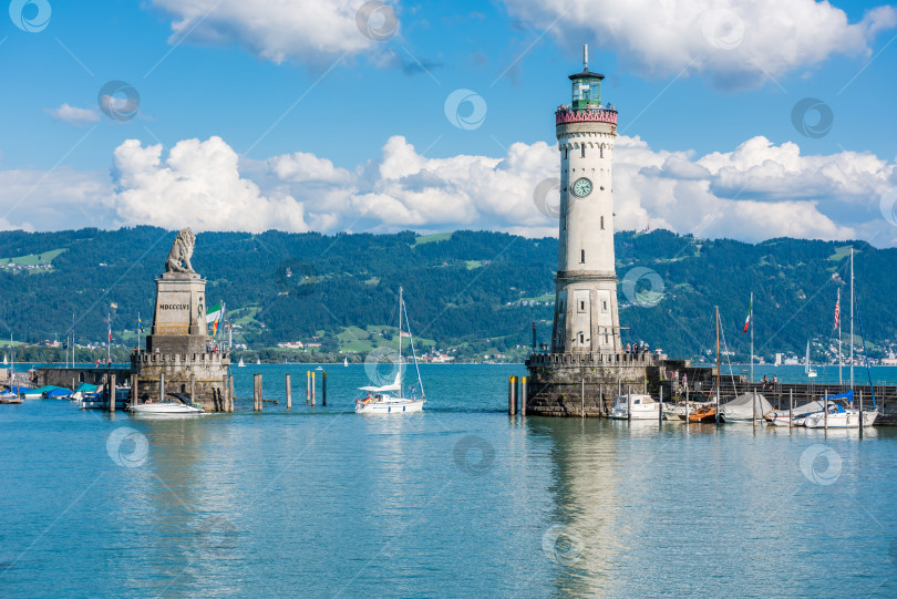 ГЕРМАНИЯ, ЛИНДАУ - 21 августа: вид на маяк и статую льва у входа в порт Линдау на Боденском озере, Бодензее, 21 августа 2015 года.