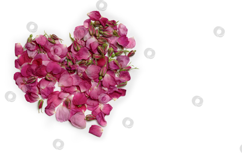 Изолировать. Сердце сделано из лепестков розы. Белый фон. Для поздравлений, свадеб, открыток, валентинок. Освободите место для текста.
