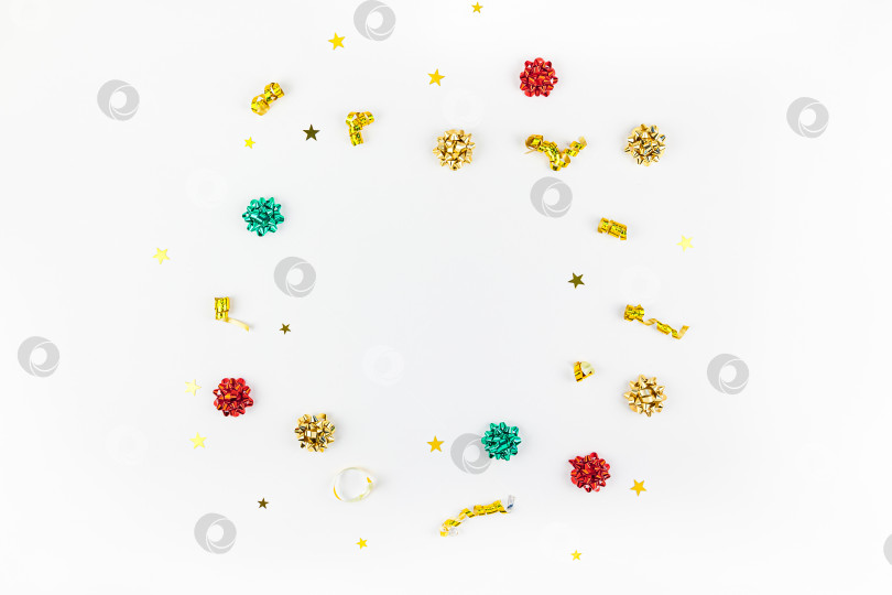 Рождественская композиция. Новогодний или рождественский узор в плоской форме, вид сверху, Рождественский праздник, декоративная золотая рамка на белом фоне с пространством для копирования. Шаблон поздравительной открытки