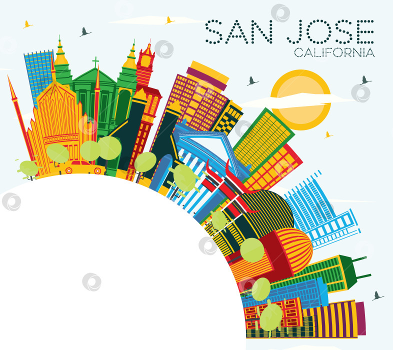 Горизонт Сан-Хосе, Калифорния, с цветными зданиями, голубым небом и пространством для копирования. векторная иллюстрация. Концепция деловых поездок и туризма в сочетании с современной архитектурой. Городской пейзаж Сан-Хосе с достопримечательностями.