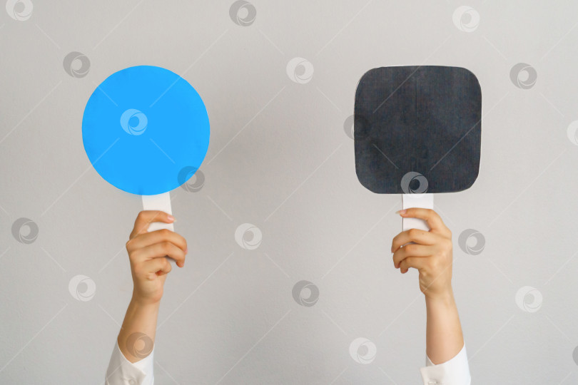 Женская рука, держащая пустой макет баннера, служит местом для копирования текста цитаты или графического оформления. Подпишите черный квадрат и синий круг женской рукой на сером фоне.