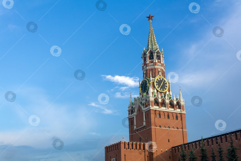 Москва, Россия - 22 июля 2025 года: Спасская башня Московского Кремля на фоне голубого неба