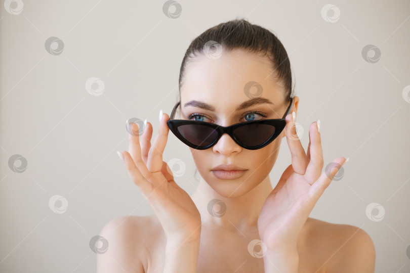 Женское лицо в солнцезащитных очках. Портрет женщины крупным планом. Молодая девушка на светлом фоне трогает руками свои очки. Концепция - продажа солнцезащитных очков. В солнцезащитных очках.