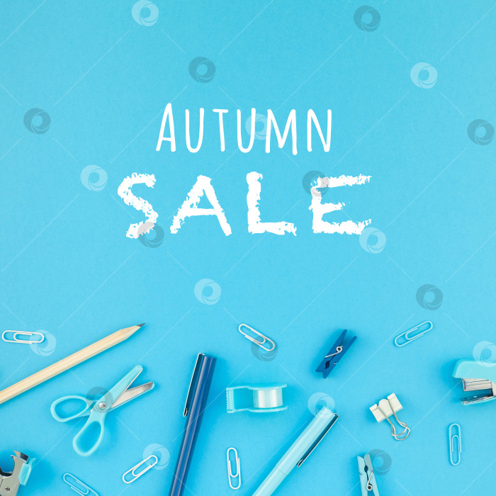 Квадратная креативная плоская планировка, вид сверху, концепция продвижения распродажи "назад в школу" с цветными школьными и офисными принадлежностями на фоне ярко-бирюзовой бумажной рамки для стола