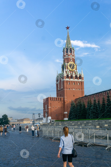 Москва, Россия - 22 июля 2025 года: Вид на Спасскую башню Кремля с Красной площади