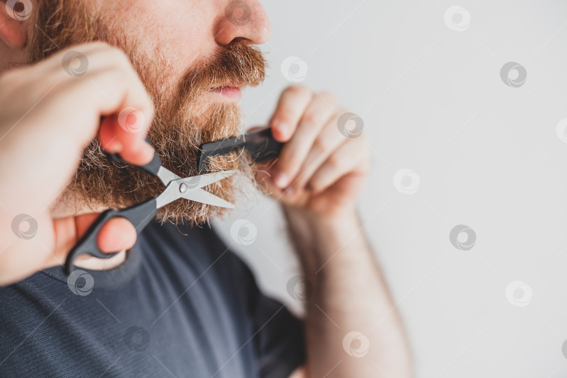 Уход за собой во время карантинной изоляции. Взрослый красивый мужчина кавказской национальности сам подстригает усы и бороду ножницами в домашних условиях. Вспышка коронавируса и остановка людей, концепция "оставайся дома"