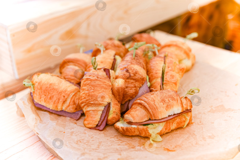 Свежеприготовленные бутерброды с круассанами, начиненные ветчиной и листьями салата, подаются на пергаментной бумаге на непринужденном мероприятии на открытом воздухе.