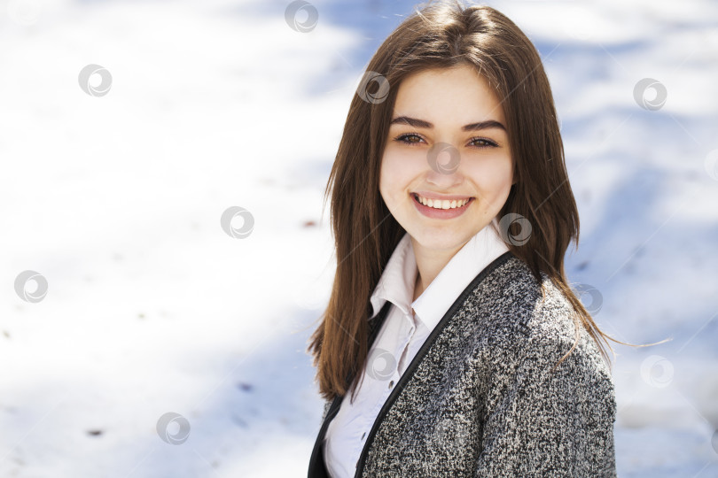 Сомкнуться Молодая красивая брюнетка в сером пальто позирует в весеннем парке