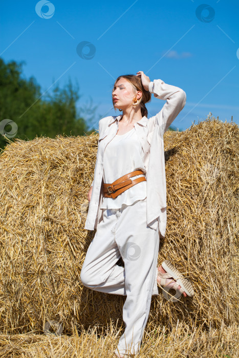 Красивая светловолосая девушка в бежевом костюме позирует на фоне стогов сена на скошенном поле.