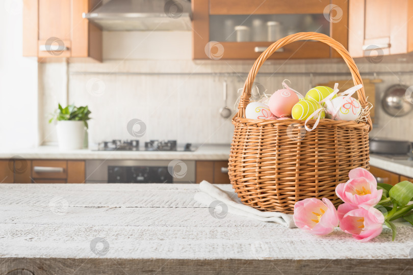 Пасхальная плетеная корзина с крашеными яйцами и тюльпанами на белой деревянной столешнице кухни. Весенняя композиция. Место для текста или дизайна.