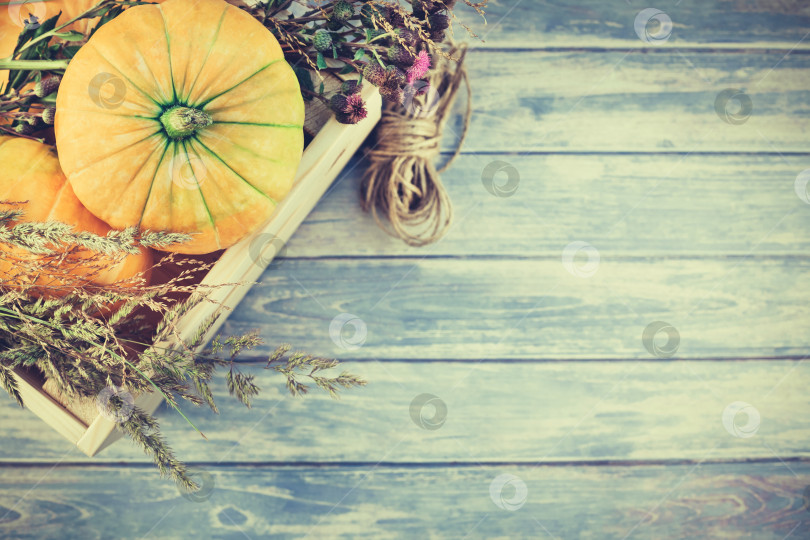 Вид сверху на осенние оранжевые тыквы, сухие цветы и траву в коробке на фоне дня благодарения на фоне деревянного стола в синих тонах с пространством для копирования. Шаблон для текста с настроением осеннего сбора урожая