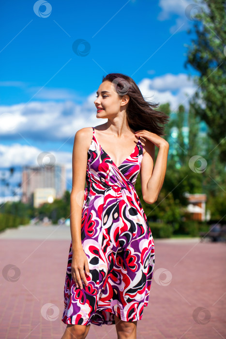 Портрет молодой красивой брюнетки в летнем платье