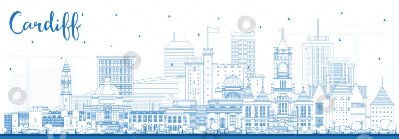 Очертите горизонт города Кардифф, Уэльс, голубыми зданиями. векторная иллюстрация. Городской пейзаж Кардиффа, Великобритания, с достопримечательностями. Концепция деловых поездок и туризма с исторической архитектурой.