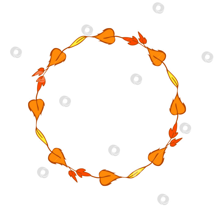 Различные листья, переплетенные в осеннем венке, выполнены в оранжевых и желтых тонах. Простая рамка из каракулей
