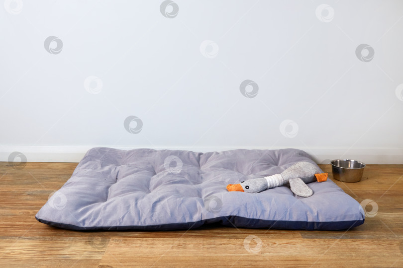 На деревянном полу установлена мягкая серая лежанка для собаки, рядом с поилкой и плюшевой игрушкой. Светлая и минималистичная зона обеспечивает собаке комфортное пребывание.