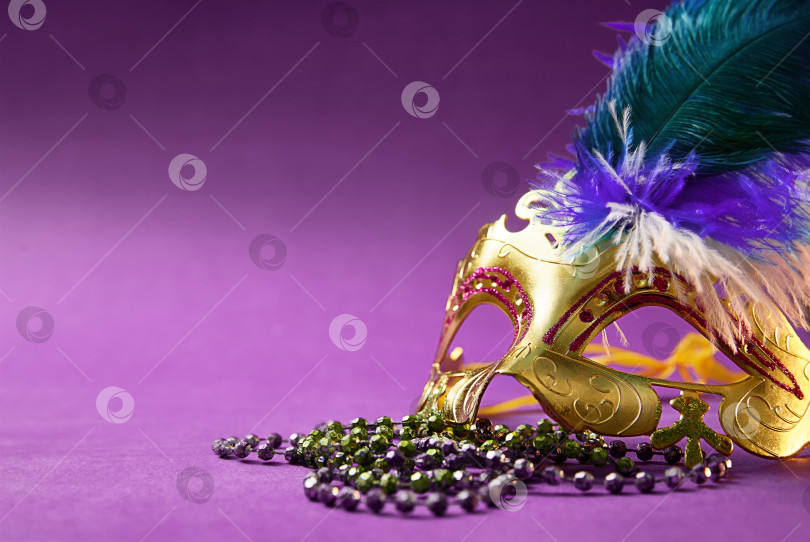 Концепция маскарадной маскировки. Фиолетовый фон с пространством для копирования. Маска с зелеными и фиолетовыми бусинами и блестками