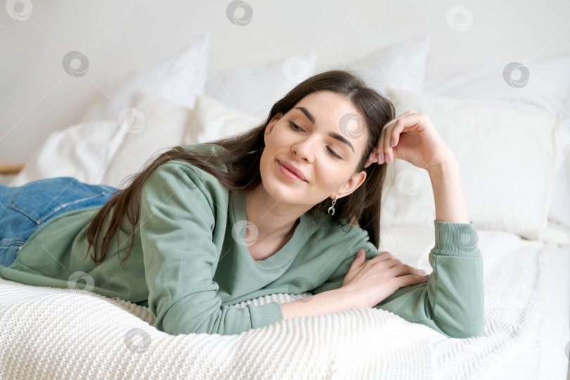 Женщина лежит на кровати, склонив голову набок. На ней зеленый свитер и синие джинсы