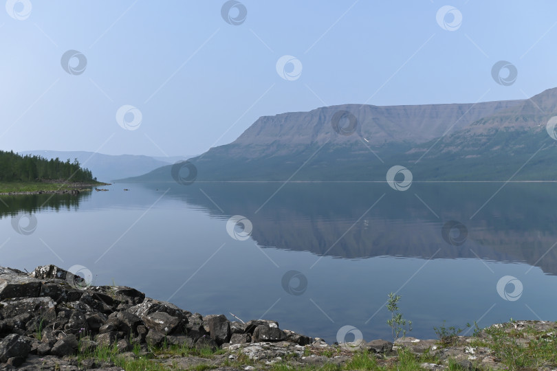 Плато Путорана, туманная дымка над озером. Летний озерный пейзаж в Восточной Сибири.