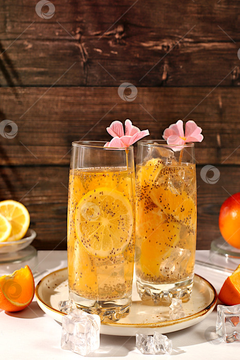 Диетический веганский коктейль с семенами чиа, апельсином, лаймом, фиалкой и льдом. Концепция детокс-диеты и похудения. Летняя вечеринка и реклама здорового образа жизни. Летний баннер и шаблон экрана